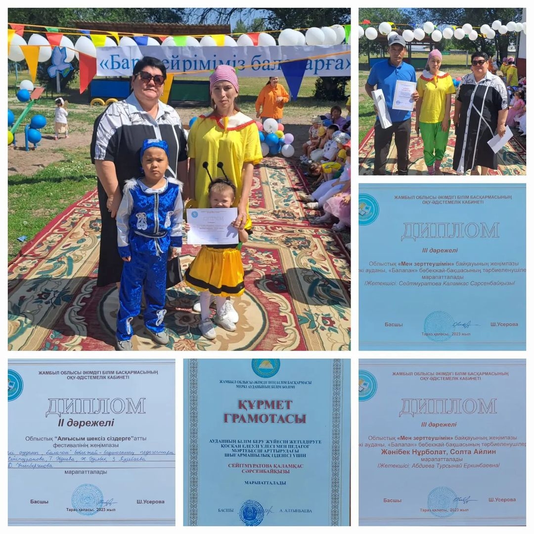 Ауданның білім беру жүйесін жетілдіруге қосқан елеулі үлесі мен педагог мәртебесін арттырудағы шығармашылық ізденісі үшін Сейтмуратова Каламкас Құрмет грамотасымен жәнеде Облыстық "Мен зеттеушімін" байқауына тәрбиеленушілермен бірге Сейтмуратова Қаламқас, Абдиева Тұрсынай 3-дәрежелі дипломмен Аудандық кәсіподақ комитетінің Құрмет грамотасы мен Аликулов Есім марапатталды.