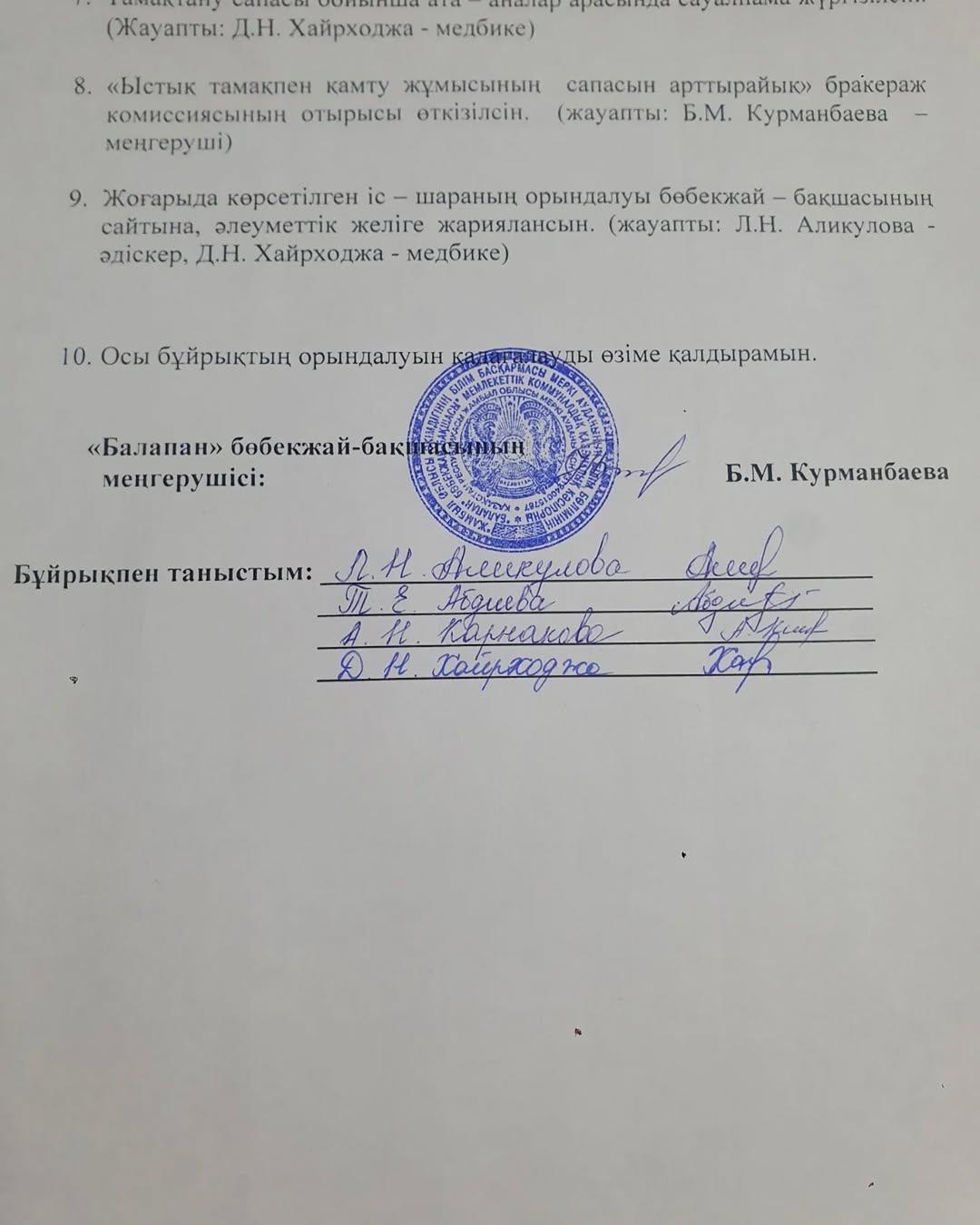 "Дұрыс тамақтануды насихаттау және тамақтану мәдениетін қалыптастыру" тақырыбында "Балапан" бөбекжай-бақшасында 10 күндік іс-шара жоспары.![]()
